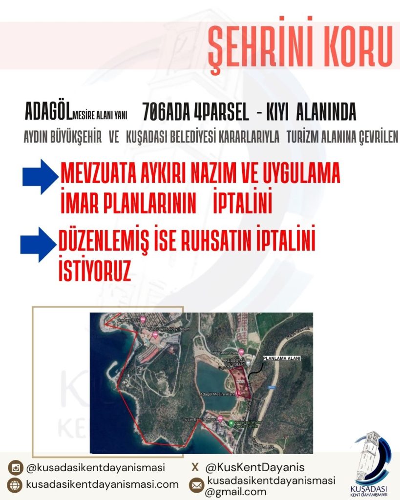 ! ADAGÖL Kıyı sınırı dikkate alınmaksızın deniz kenarına mesafesi “kıyı kenar çizgisi” olarak tanımlanarak 50metre, taşıt yolundan 7 metre, kuzey cepheden 5 metre yapı yaklaşma mesafeli turizm alanı (otel) amaçlı1/1000 ölçekli Uygulama İmar Planı teklifi Kuşadası Belediye Meclisi’nin 02.05.2023 tarih ve 219 sayılı karar ile uygun bulunduğu ve imar plan tadilatının yapıldığı tespit edilmiştir.