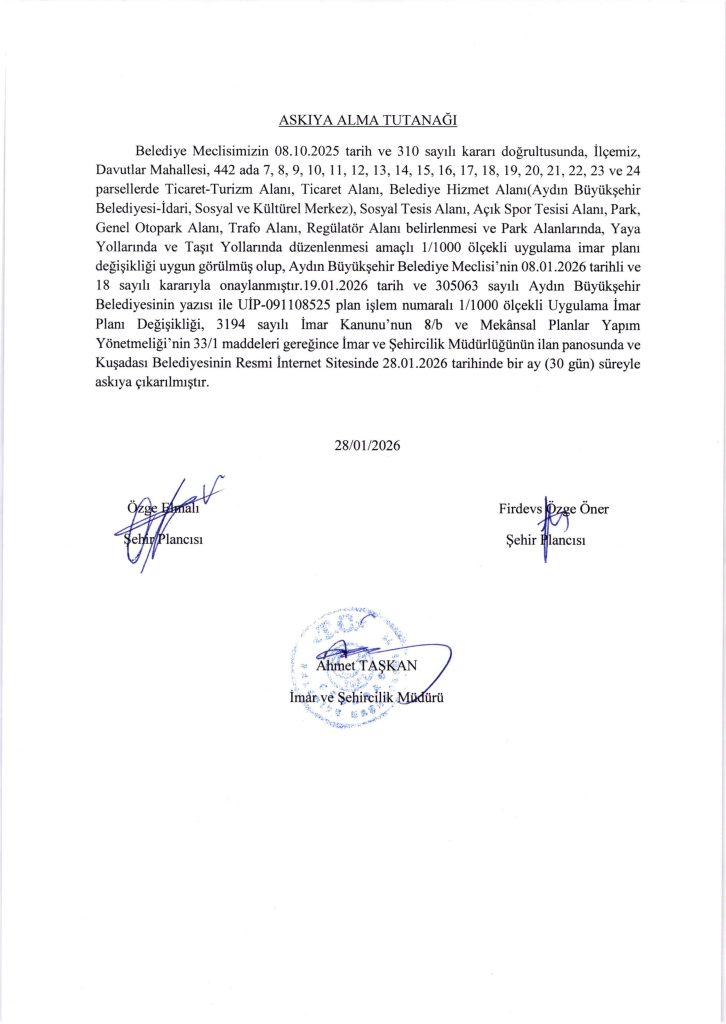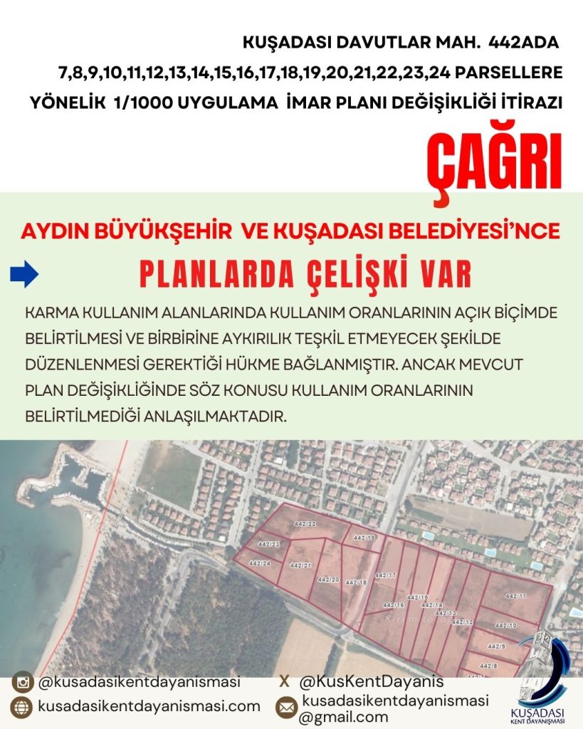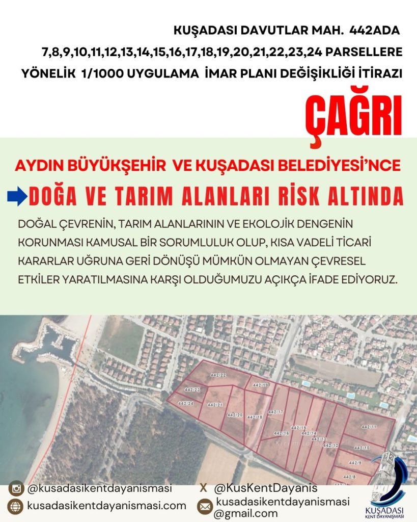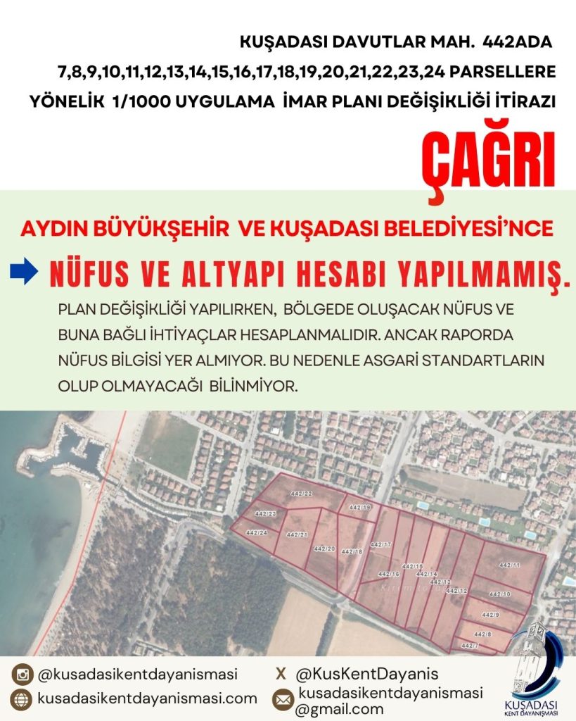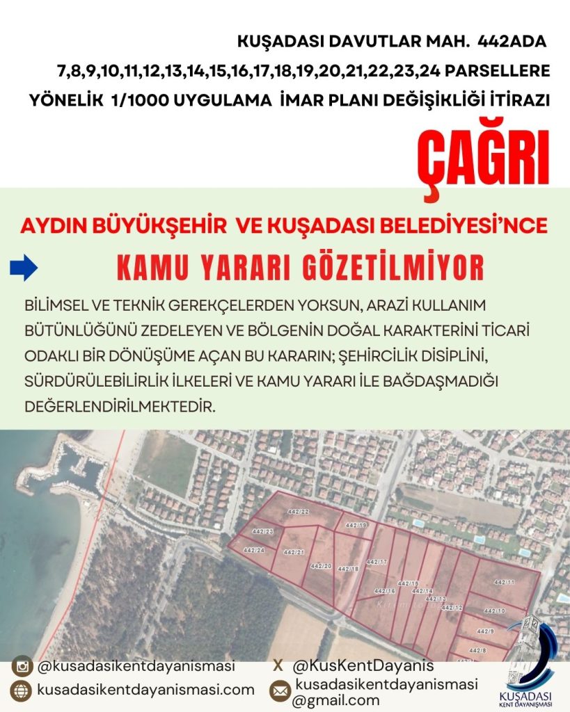 Kuşadası Kent Dayanışması olarak, askı süreci devam eden 442 ada 7–24 parsellerini kapsayan 1/1000 ölçekli Uygulama İmar Planı değişikliğine karşı;